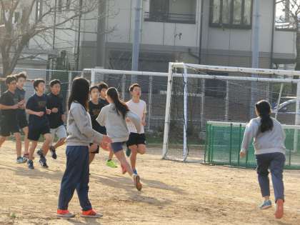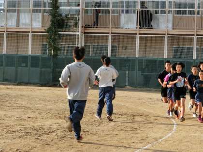 長距離部と短距離部がグラウンドを共有するため、トラックの外・内、時計回り・反時計回りで走ります。写真は交差しているところです。
