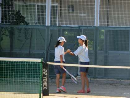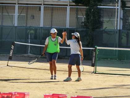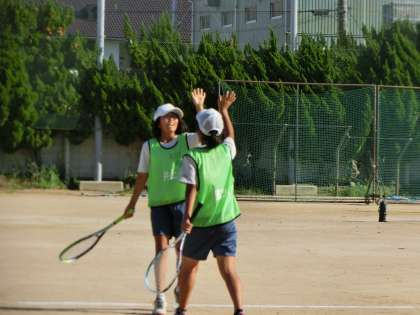 ソフトテニスの試合はペアのみで、ポイントを取ったときはペア同士で手をあわせます。