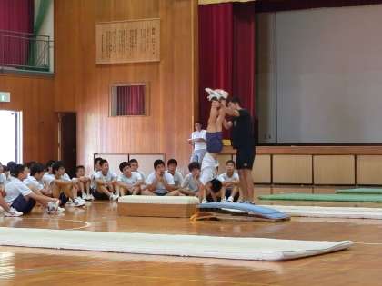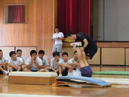 マット運動の授業です。見本となる生徒の動きを見てイメージします。