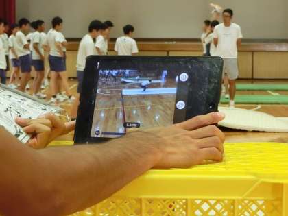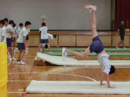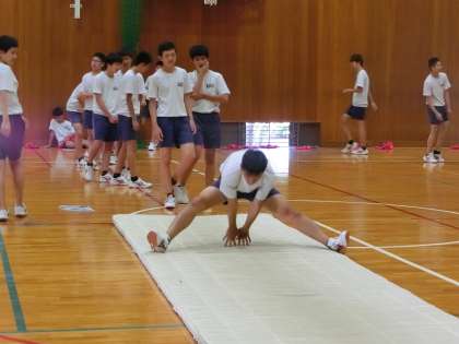 ポイント説明を受けた後、4つのグループに分かれて「開脚前転」「倒立前転」「伸膝前転」「跳び前転」に挑戦!ipadで確認するグループは、跳んだ後、自分で確認します。修正点を見つけて次に活かします。