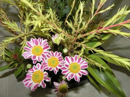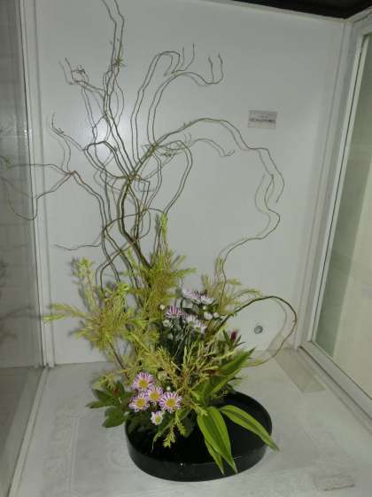 10月10日 玄関の生け花が新しいお花になりました。後ろ側の細い木は枝ぶりが見事です。絶妙な曲線を描き、影が映り複雑な構成美をつくっています。どうぞご覧下さい。
