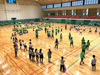 1年生は総合体育館を借りての小体育大会 「団結しな祭」をしています。 現在ふた種目めのドッヂボールです。