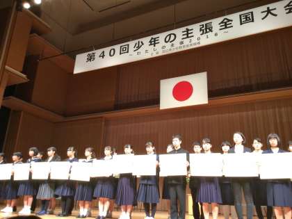 11月11日 9月に行われた「中学生の主張 大阪府大会」で最優秀賞を受賞し全国大会へ推薦されて参加しています。全国大会では努力賞が授与されました。5月から構想を練り取り組んだ成果です。おめでとうございます。