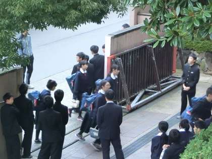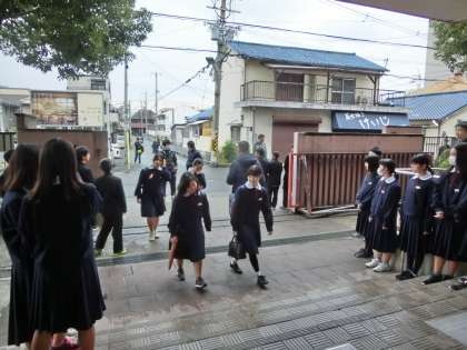 11月19日 朝の挨拶活動の様子です。今日は、3年生実力テスト、2年生一部生徒は、保育福祉体験学習の打ち合わせ日となっています。