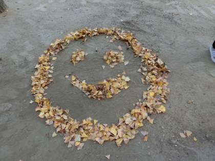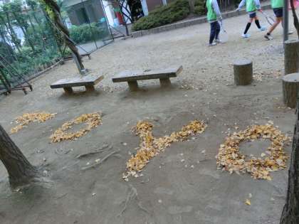 12月3日 先日の「すっきりピカピカFINAL!!」に参加できなかった生活環境委員が中庭の溝掃除を行いました。落ち葉の美しいイチョウを集めて絵文字を作成、清掃は後日実施します!