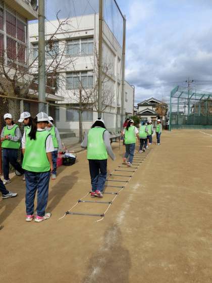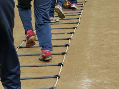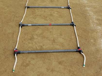 ラダー(パイプとロープをつないだ手作りです!)を使ったトレーニングを取り入れて俊敏性、敏しょう性などを鍛えています。