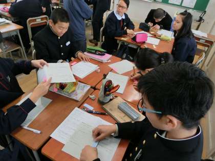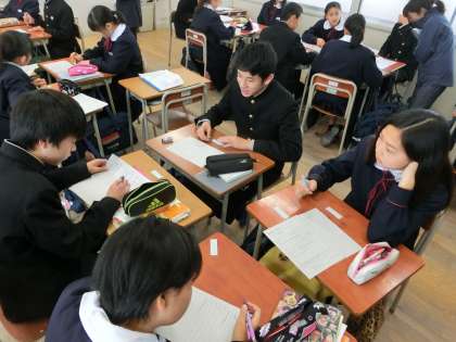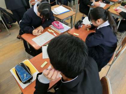 前回の授業で社会生活の中で興味をもったことに関する情報を集めて自分の意見をまとめています。今日はグループ内でそれを提案しました。