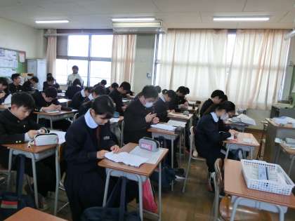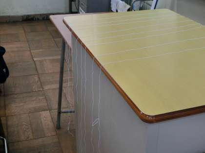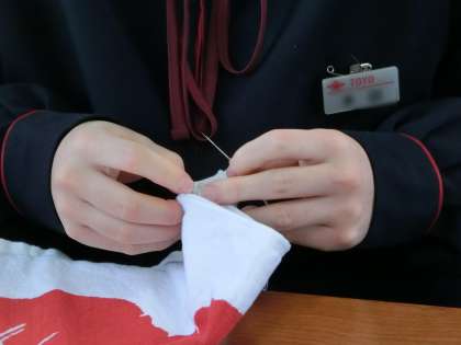 雑巾製作三年目の3年生は手慣れた様子です。糸通しにひと工夫しているクラスは、糸を教卓に垂らして糸替えもスムーズに!