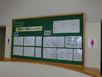 写真は、今年度取り組んでいる確かな学びを育むプロジェクトの一つ、週末課題の掲示コーナーです(新館)。