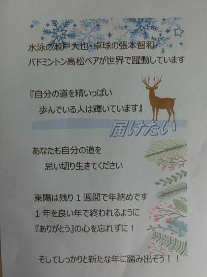玄関の言葉 公開日 2018/12/17 更新日 2018/12/17 学校行事・お知らせ・生徒会 12月17日 玄関の言葉より 残り1週間で年納めです。1年を良い年で終われるように『ありがとう』の心を忘れずに!!