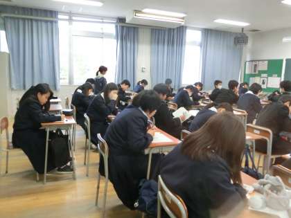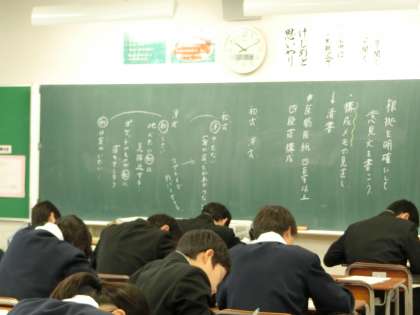 12月19日 2年国語の授業風景です。自分でテーマを設定し、グループ学習でメンバーから意見をもらってすすめてきました。今日は意見文を原稿用紙にまとめました。