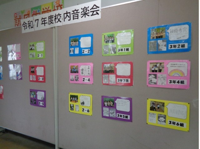 音楽会当日まであと1日です。音楽の授業の熱心さがいつも以上です。各クラスの意気込みと表紙絵の掲示物が一覧になりました。