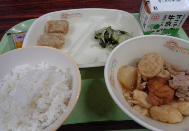 音楽会の今日の給食は、ごはん・牛乳・関東煮(卵なし)・きゅうりの酢の物・あじナゲット でした。