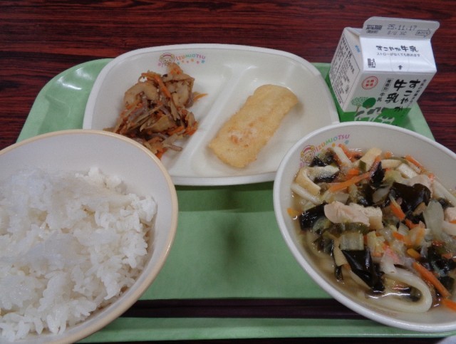 今日の給食は、減量ごはん・牛乳・わかめうどん・ちくわとごぼうのきんぴら・いかの天ぷら でした。