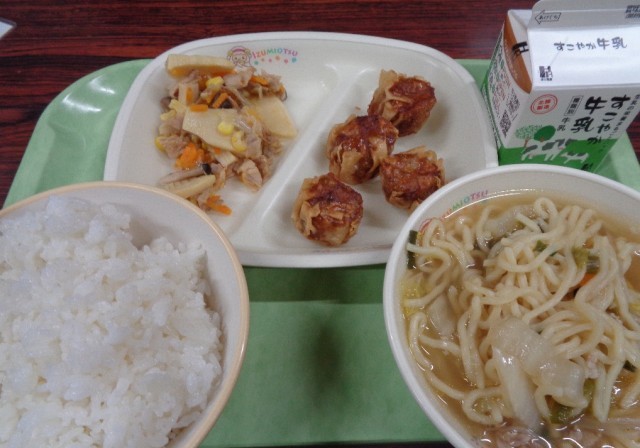 今日の給食は、減量ごはん・牛乳・野菜タンメン・焼豚としめじの中華炒め・揚げしゅうまい でした。