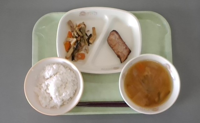 今日の給食は、ごはん、かぶのみそ汁、ぶりの照り焼き、豚肉と小松菜の和風炒めです。