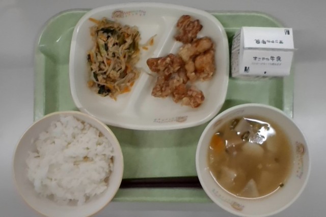 今日の給食は、牛乳・ごはん・のっぺい汁・鶏肉のから揚げ・和風炒めです。