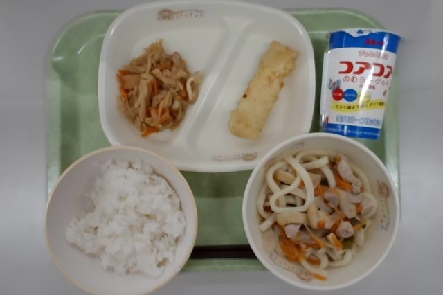 今日の給食は、コアコア・減量ごはん・きざみうどん・いかの天ぷら・切り干し大根の煮物です。