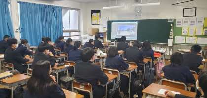 本日は誠風中学校と中学校区小学校、戎・穴師・楠小学校の合同オンライン朝礼がありました。