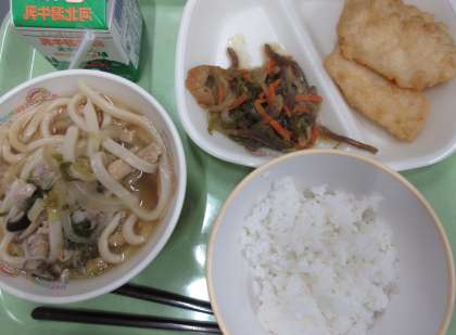今日の献立は、イカの天ぷら、きんぴらピーマン、きざみうどんでした。うどんの出汁は、昆布とかつおのうま味成分がぎゅっと詰まって美味しかったです。