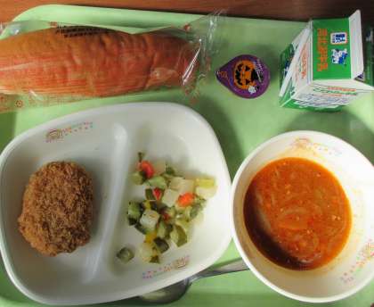 今日の献立は、ミートビーンズ、イタリアンマリネ、かぼちゃコロッケ、ハロウィンミニゼリーでした。給食を残さず食べて、健康な身体を作ろう!明日は体育大会。お天気も味方してくれそうですね。