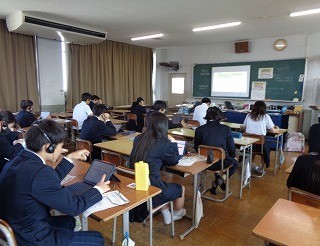 3年生は全国学力学習状況調査の英語・話すこと調査が行われました。今日はマイク付ヘ...