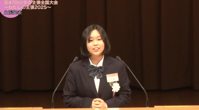 11月16日(日)、東京都の国立オリンピック記念青少年総合センターにて「第47回 少年の主張全国大会~わたしの主張2025~」が開催されました。全国で約 35万人 が応募するこの大会。各都道府県の予選を勝ち抜いた わずか12名 だけが立つことのできる大舞台です。小津中学校から、3年生の 中村詩織さんが近畿・中部ブロックの代表として出場しました。
