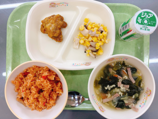 今日の給食は卒業前に食べたい給食アンケートの大おかず1位「ABCスープ」と小おかず3位「タンドリーチキン」です!!