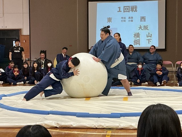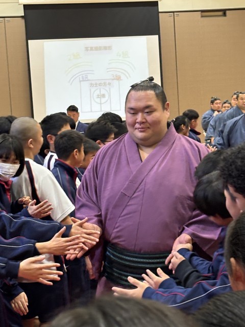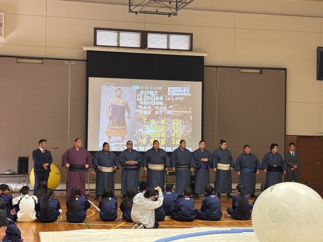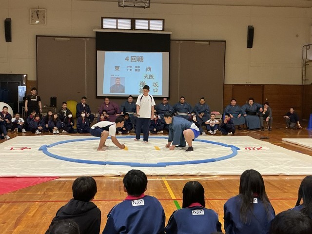 現在、3月の大相撲大阪場所に向けて泉大津市内に宿舎を構えられている中村部屋。今回の交流は、先日、中村親方(元関脇・嘉風)が本校を訪問された際、1年生が体育の授業で取り組んでいる「シンSUMO」をご覧になったことがきっかけで実現しました。