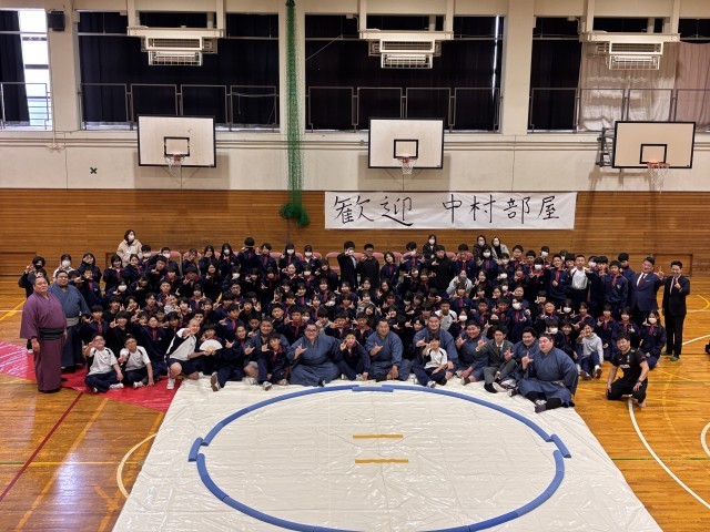 本日、小津中学校の体育館にて、大相撲・中村部屋の皆様をお招きした特別交流会を開催いたしました。