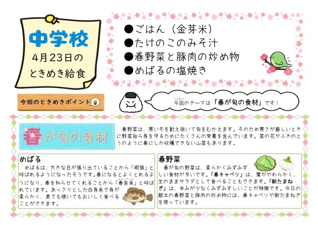 ときめき給食の紹介(4/23テーマ「春が旬の食材」)